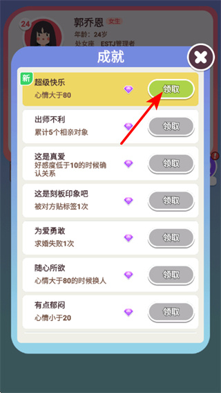 3、在游戲中領取成就獎勵,獎勵領取是積累資源的關(guān)鍵環(huán)節(jié),領取后可獲取鉆石等資源,助力角色發(fā)展和戀愛進程。