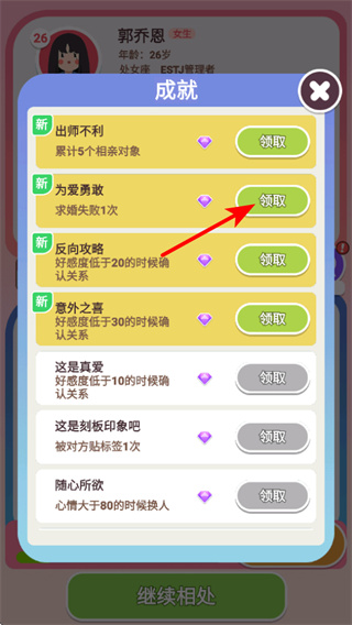 2、在游戲中領(lǐng)取成就獎(jiǎng)勵(lì),獎(jiǎng)勵(lì)領(lǐng)取是積累資源的核心步驟,領(lǐng)取后可獲取鉆石等資源,助力角色在戀愛進(jìn)程中提升魅力機(jī)會(huì)。