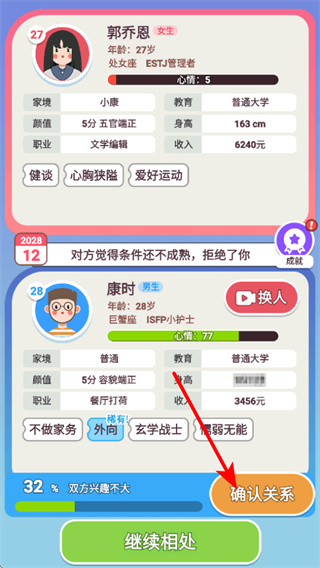 3、在戀愛相處中確認(rèn)關(guān)系,關(guān)系確認(rèn)是推進(jìn)劇情的關(guān)鍵環(huán)節(jié),確認(rèn)后可與對(duì)象建立戀愛關(guān)系,深入體驗(yàn)戀愛發(fā)展的不同階段。