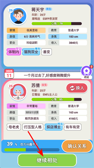 核心操作以點(diǎn)擊為主,通過點(diǎn)擊提升對(duì)方好感度,流程簡(jiǎn)單直觀,無需復(fù)雜學(xué)習(xí),輕松就能開啟相親與生活模擬之旅。