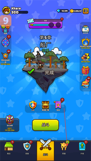 1、點(diǎn)擊“戰(zhàn)斗”按鈕進(jìn)入不同章節(jié),如船廠等場(chǎng)景開(kāi)啟冒險(xiǎn),擊敗敵人推進(jìn)章節(jié)進(jìn)度。