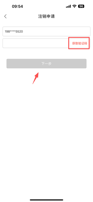4、在注銷申請頁面,點擊獲取驗證碼,輸入驗證碼后點擊下一步按鈕,完成賬號注銷操作。