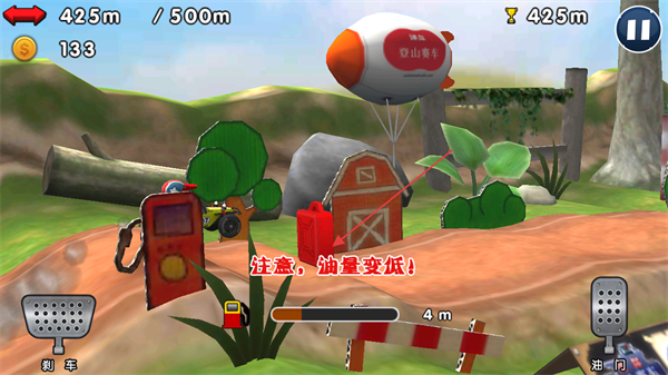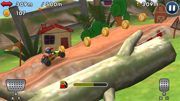1、駕駛賽車在登山賽道行駛,收集金幣,注意左上角行駛距離,目標完成500m等賽程。