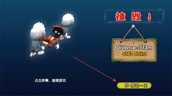 4、若賽車撞毀,可點擊“再試一次”重新開始游戲,繼續(xù)挑戰(zhàn)登山賽程。