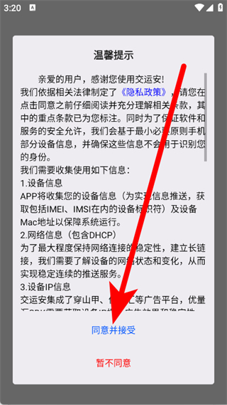 1、打開交運(yùn)安,在隱私政策溫馨提示彈窗中,點(diǎn)擊同意并接受。