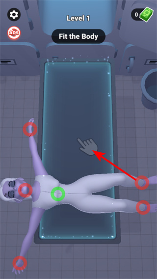 1、按照提示拖動人體模型的肢體部位,使其與輪廓契合,完成尸體拼接,準確操作才能通過關卡。