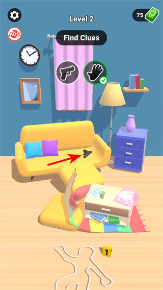 2、仔細觀察場景中的可疑物品如沙發(fā)上的手槍,點擊這些物品可收集線索,助力偵破,推進進程。