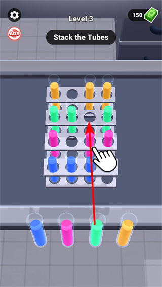 3、按照顏色提示堆疊試管,將相同顏色的試管整理到一起,可完成試管堆疊任務,通過關卡。