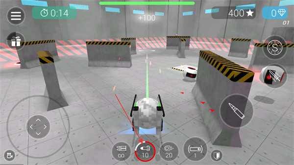 3、在場(chǎng)景內(nèi),機(jī)器人不能超出紅色標(biāo)記區(qū)域,點(diǎn)擊下方的子彈類型可以切換機(jī)器人使用的武器。