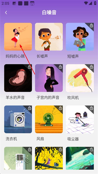 1、在金寶貝早教首頁,點擊白噪音選項,進入白噪音選擇頁面。