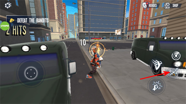 2、點(diǎn)擊右側(cè)帶有武器圖標(biāo)的按鍵發(fā)動攻擊,可對匪徒造成傷害,這是完成任務(wù)的關(guān)鍵操作,攻擊時(shí)需留意匪徒位置。