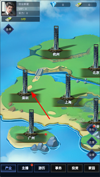 4、在產(chǎn)業(yè)地圖界面,點(diǎn)擊如深圳之類的城市地標(biāo),這是拓展產(chǎn)業(yè)布局、開啟專屬商業(yè)劇情關(guān)鍵操作,推進(jìn)產(chǎn)業(yè)發(fā)展進(jìn)程。