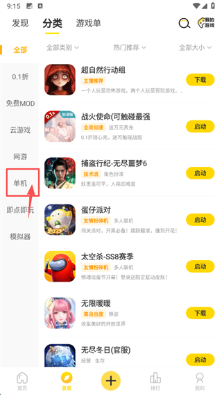 3、在分類頁面,點(diǎn)擊單機(jī)分類標(biāo)簽,進(jìn)入單機(jī)游戲列表頁面。