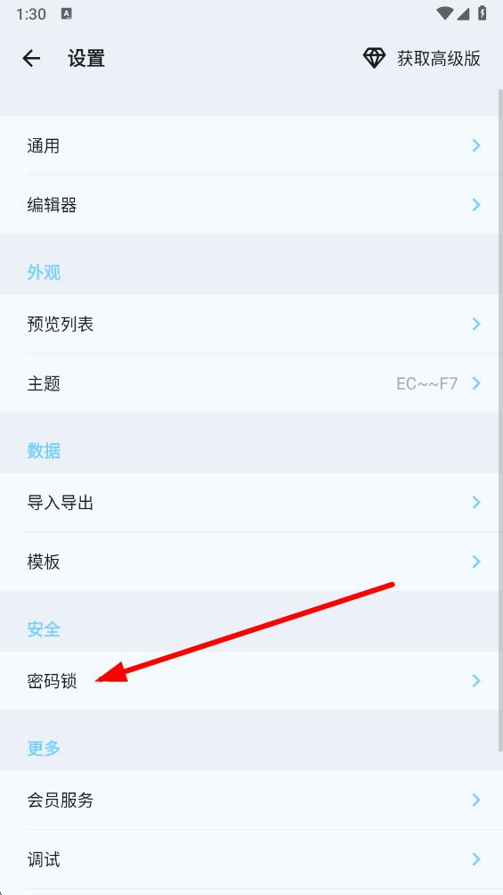 3、在設(shè)置界面里,向下滑動(dòng)找到安全板塊,點(diǎn)擊其中的密碼鎖選項(xiàng)。
