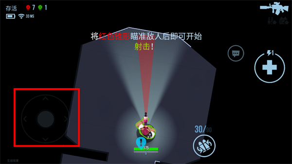1、在子彈回聲游戲界面,通過(guò)左側(cè)虛擬搖桿控制角色移動(dòng),將紅色鎖狙瞄準(zhǔn)敵人后即可開(kāi)始射擊。