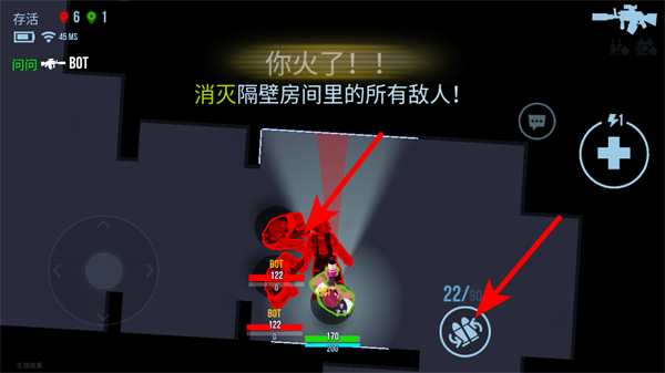 3、消滅敵人后會(huì)觸發(fā)“你火了”狀態(tài),需消滅隔壁房間里的所有敵人,可使用右側(cè)技能按鈕輔助戰(zhàn)斗。