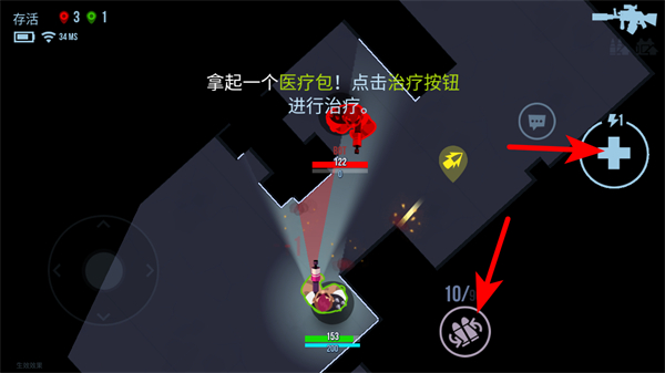4、需注意血量,拿起醫(yī)療包后點(diǎn)擊治療按鈕可進(jìn)行治療,合理利用資源完成游戲任務(wù)。