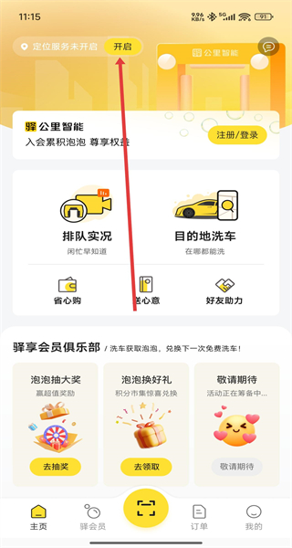 1、打開驛公里洗車APP,點擊界面上方的開啟按鈕,彈出定位權(quán)限提示框。