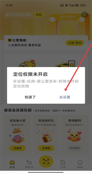2、在定位權(quán)限提示框中,點擊去設(shè)置選項,進入驛公里洗車的位置權(quán)限設(shè)置界面。