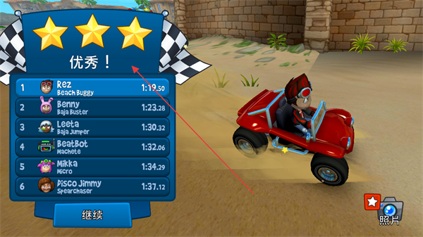 2、根據(jù)玩家車(chē)輛越過(guò)終點(diǎn)線的用時(shí)進(jìn)行排名,獲取游戲星級(jí)評(píng)分。
