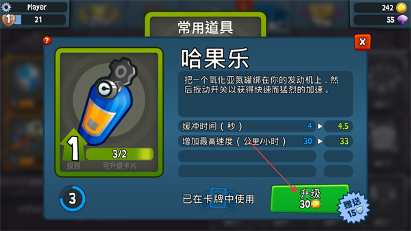 4、點(diǎn)擊進(jìn)道具信息頁(yè)面,通過(guò)消耗卡片和金幣來(lái)升級(jí)道具的屬性值。