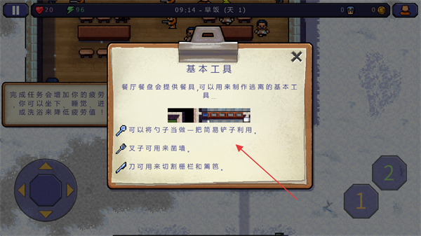 4、了解基本工具用途,勺子可當(dāng)簡易鏟子,叉子可鑿墻,刀可切割柵欄和籬笆,為逃離做準(zhǔn)備。