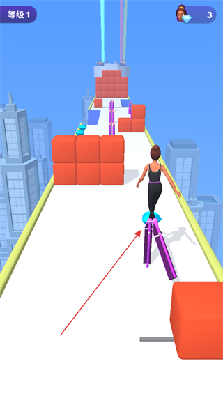 1、操控角色在跑道上奔跑,收集紫色鞋跟,增加高跟鞋高度。
