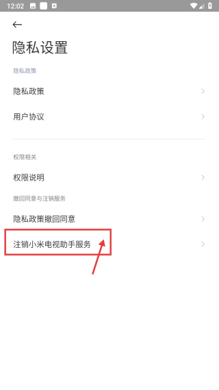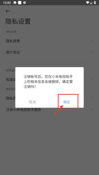 3、在隱私設(shè)置頁面,點(diǎn)擊注銷小米電視助手服務(wù)選項(xiàng),彈出注銷確認(rèn)彈窗。