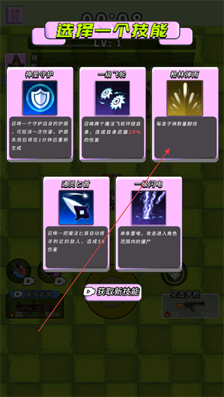 1、升級時選擇技能如森林饋贈,增強攻擊能力,提升戰(zhàn)力。