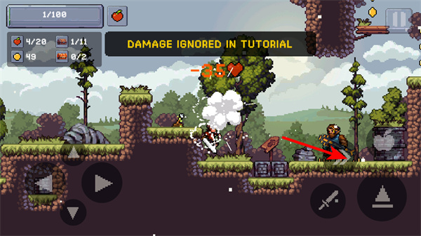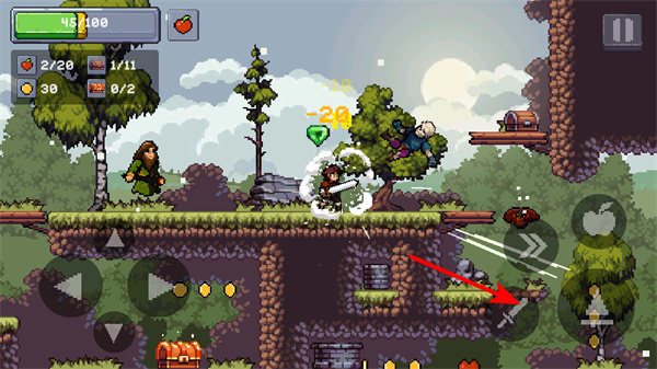 左側(cè)控制角色移動(dòng),右側(cè)對(duì)應(yīng)攻擊、沖刺、跳躍和投擲蘋果等功能,操作邏輯清晰,無需復(fù)雜學(xué)習(xí),新手也能快速適應(yīng)并投入戰(zhàn)斗。