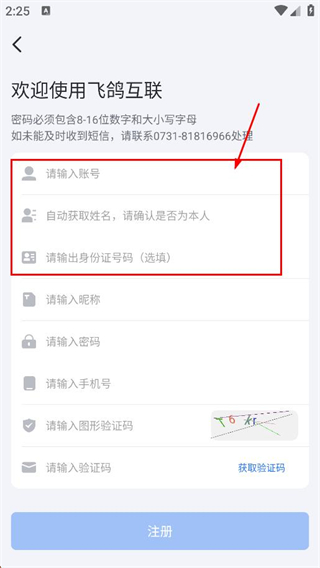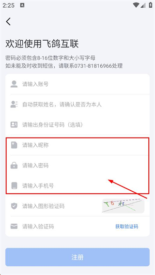 3、輸入昵稱、8-16位包含數(shù)字和大小寫字母的密碼,以及手機號。