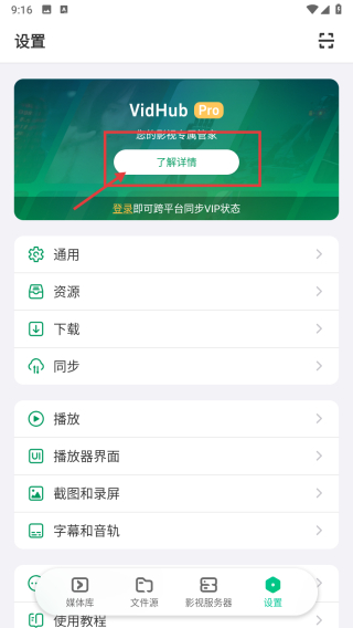 2、在設(shè)置頁面,點(diǎn)擊了解詳情按鈕,進(jìn)入VidHub-Pro升級(jí)頁面。