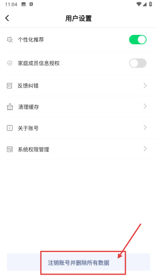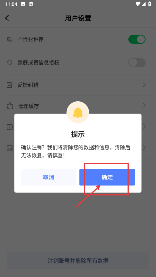 3、在用戶設(shè)置頁(yè)面,點(diǎn)擊注銷賬號(hào)并刪除所有數(shù)據(jù)選項(xiàng),彈出確認(rèn)注銷提示框。