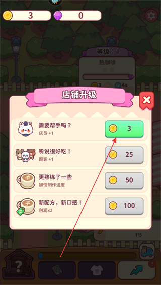4、積累金幣后,進(jìn)行店鋪升級(jí)如消耗3個(gè)金幣增加店員,提升店鋪運(yùn)營(yíng)效率,吸引更多顧客。