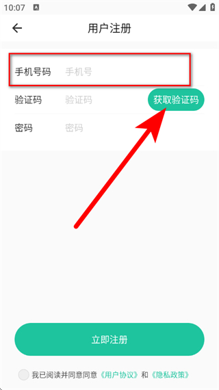 4、在注冊頁面,輸入手機號碼后,點擊獲取驗證碼。