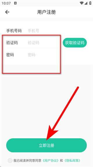 5、輸入驗證碼、密碼,勾選已閱讀并同意后,點擊立即注冊,完成操作。
