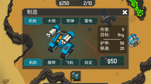 3、點(diǎn)擊左下角的機(jī)甲選項(xiàng),完成一些建筑的建設(shè)可以解鎖機(jī)甲升級的條件,點(diǎn)擊右下角花費(fèi)50金幣升級機(jī)輪。