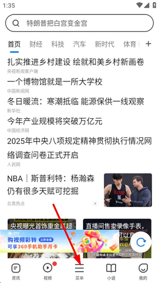 1、在360瀏覽器首頁,點(diǎn)擊底部導(dǎo)航欄的菜單選項(xiàng),可展開功能菜單頁面。