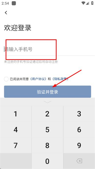 3、在歡迎登錄頁面填寫手機(jī)號,勾選協(xié)議后點(diǎn)擊驗證并登錄。