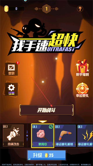 1、打開(kāi)我手速超快游戲主頁(yè),點(diǎn)擊中間的開(kāi)始戰(zhàn)斗按鈕進(jìn)入挑戰(zhàn)。