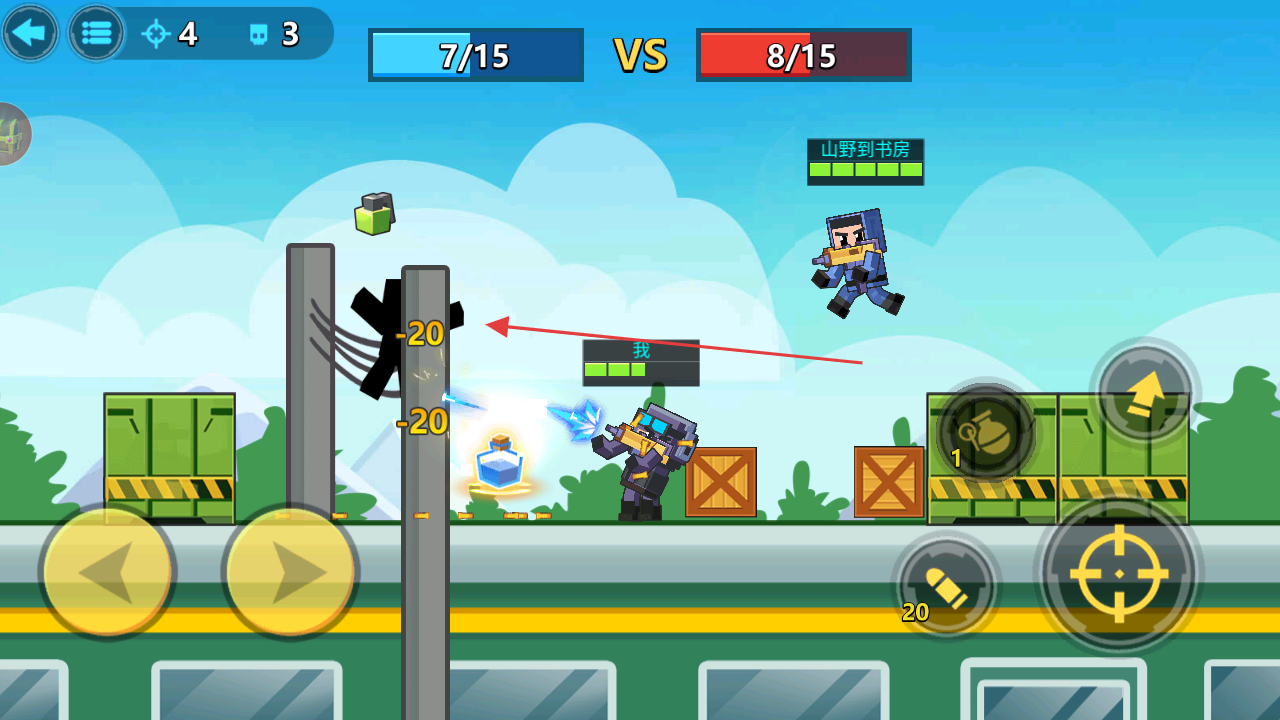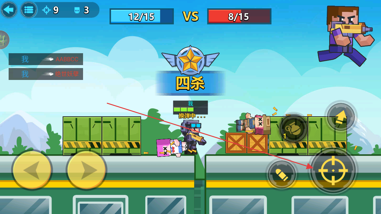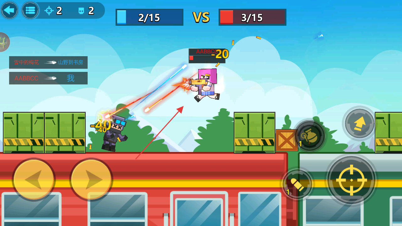 1、操控角色移動,點(diǎn)擊攻擊按鈕瞄準(zhǔn)敵方射擊,積累擊殺數(shù)縮小比分差距。