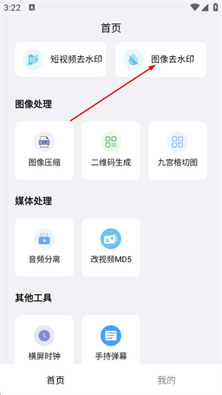 2、在應(yīng)用首頁,點(diǎn)擊圖像去水印功能按鈕,進(jìn)入圖像去水印操作頁面。