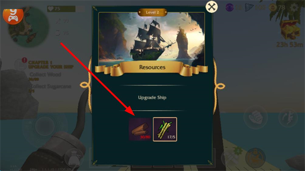 2、查看升級(jí)資源要求,進(jìn)入船只升級(jí)界面后,能看到當(dāng)前所需木材與甘蔗的數(shù)量,以此規(guī)劃采集方向。