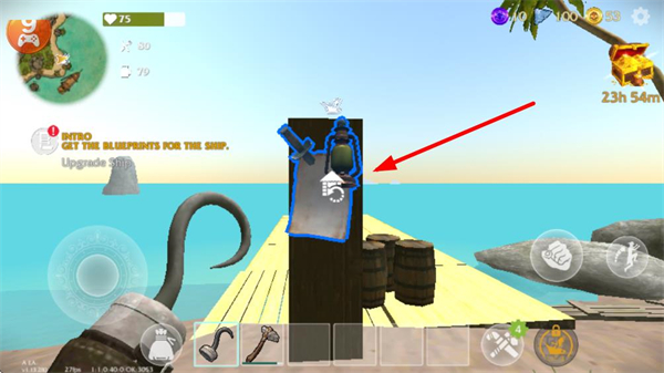 1、在初始場(chǎng)景中找到帶藍(lán)色標(biāo)識(shí)的木板,先獲取船只圖紙,再次點(diǎn)擊后可查看船只升級(jí)所需資源。
