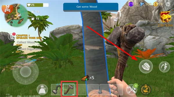 3、切換工具采集資源,在道具欄中選擇斧頭類工具,對(duì)場(chǎng)景中的樹木進(jìn)行互動(dòng),每次采集可獲得木材。