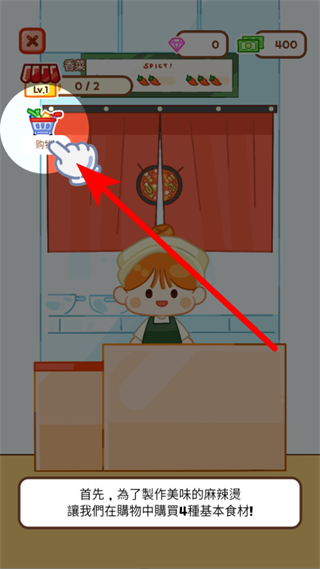 3、根據(jù)游戲提示,點(diǎn)擊購(gòu)物按鈕,進(jìn)入食材采購(gòu)界面準(zhǔn)備購(gòu)買(mǎi)所需食材。