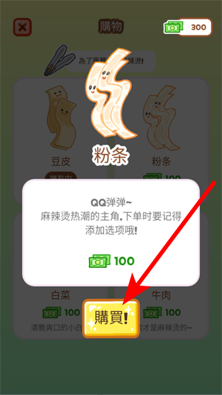 4、選擇需要的食材如粉條,點(diǎn)擊“購(gòu)買(mǎi)!”按鈕完成該食材的采購(gòu),繼續(xù)集齊食材。