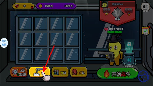 1、點擊紅色箭頭指向的武器圖標如手槍,消耗資源解鎖該武器,這是獲取戰(zhàn)斗裝備的關鍵操作。