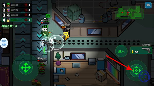 3、緊跟紅色箭頭指引,點擊右側瞄準按鈕鎖定敵方目標,再發(fā)起攻擊擊敗敵人、減少自身損傷策略。