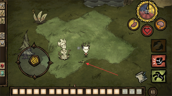 1、操控角色靠近發(fā)光資源點,可采集基礎物資,觀察右上角天數(shù)1等狀態(tài),保障生存。
